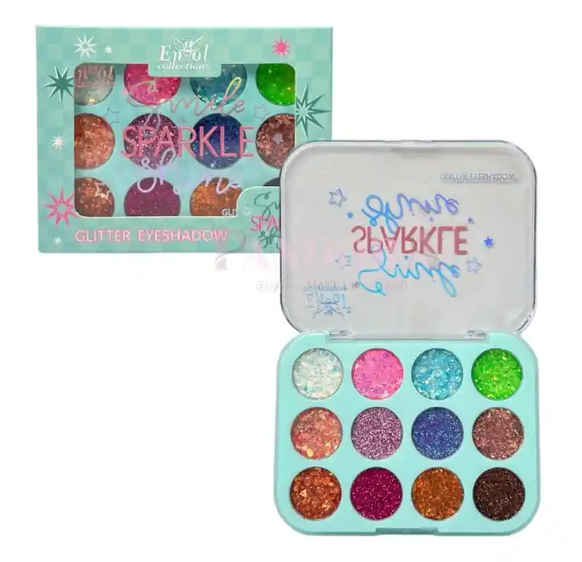 La imagen muestra una paleta de sombras de ojos con purpurina de la marca Engol Collections. La paleta se llama "Glitter Eyeshadow" y presenta 12 tonos de purpurina en gel. La paleta contiene brillos multidimensionales en una base de gel adhesivo, por lo que no se necesita pegamento adicional. Los glitters son texturizados en gel y tienen una alta pigmentación, lo que facilita su aplicación. Es un producto colombiano de maquillaje. La paleta está diseñada para crear looks con brillo y destello intenso.