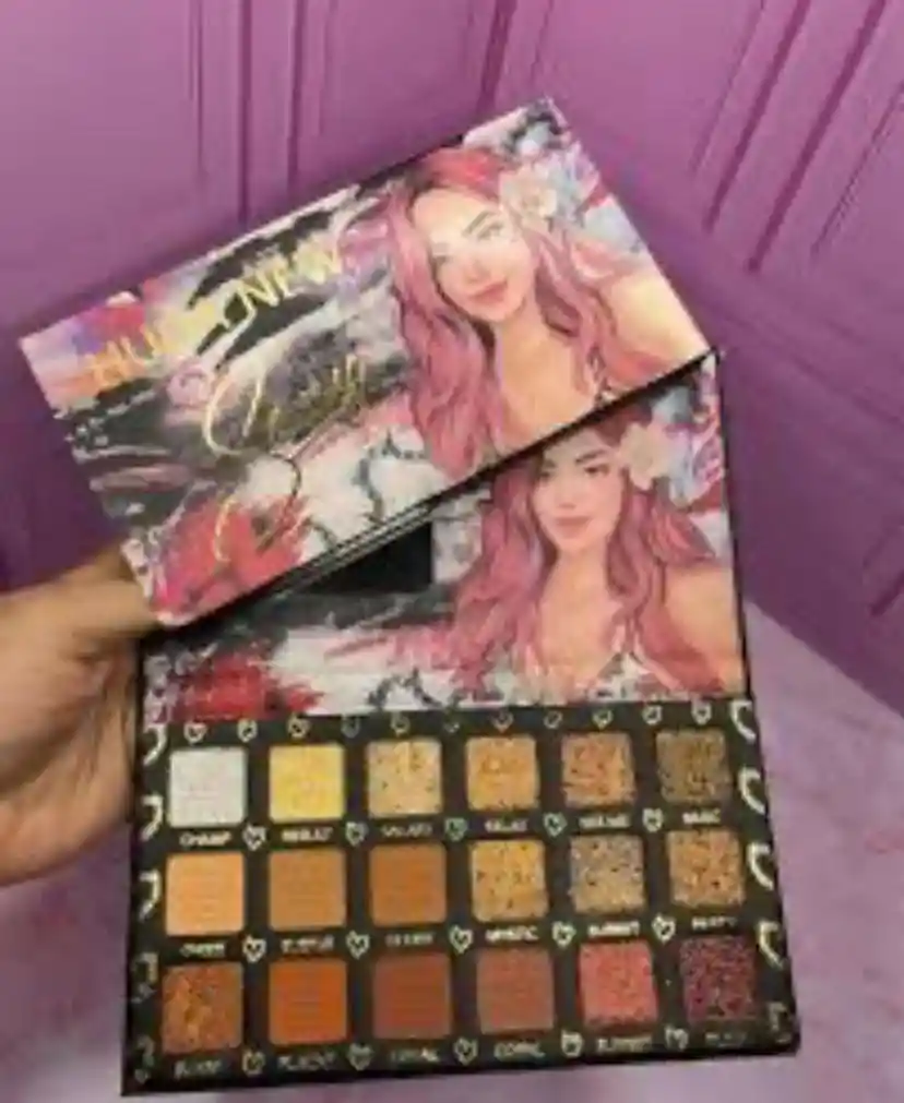 La imagen muestra la paleta de sombras de ojos de Huda new. La paleta contiene 18 tonos de sombras, incluyendo acabados mate, cremosos y metálicos. Las sombras son conocidas por su textura suave y alta pigmentación, lo que facilita su aplicación y mezcla.