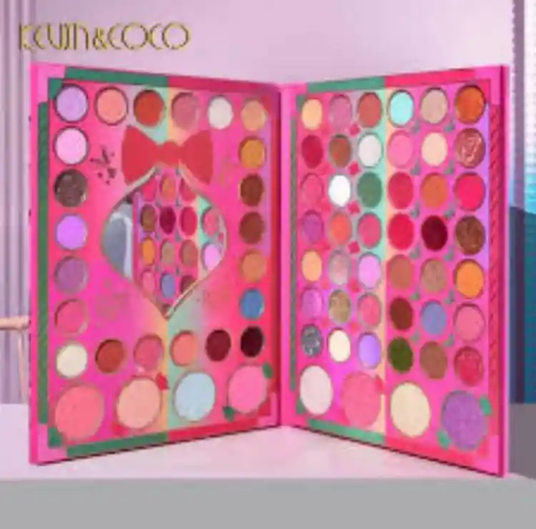 Es una paleta de maquillaje completa Kevin & Coco Christmas Babe, con 64 tonos de sombras, 4 rubores y 4 iluminadores
