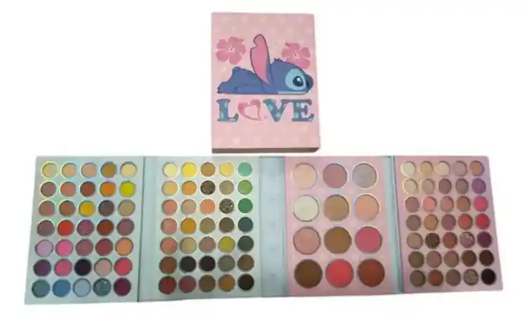 Diseño Exterior: La paleta presenta una cubierta superior de color rosa pastel con una ilustración de Stitch rodeado de estrellas y destellos. Contenido: Es una paleta grande que se despliega en tres niveles, cada uno con diferentes tonos de productos cosméticos. Nivel Superior: Contiene una fila de tonos neutros y una fila de tonos verdes y brillantes. Nivel Medio: Incluye tonos más cálidos como marrones, rosas y tonos de rubor o iluminador. Nivel Inferior: La sección más grande, con una amplia gama de tonos cálidos, que van desde brillos hasta mates, en colores melocotón, rosa, marrón y neutros.