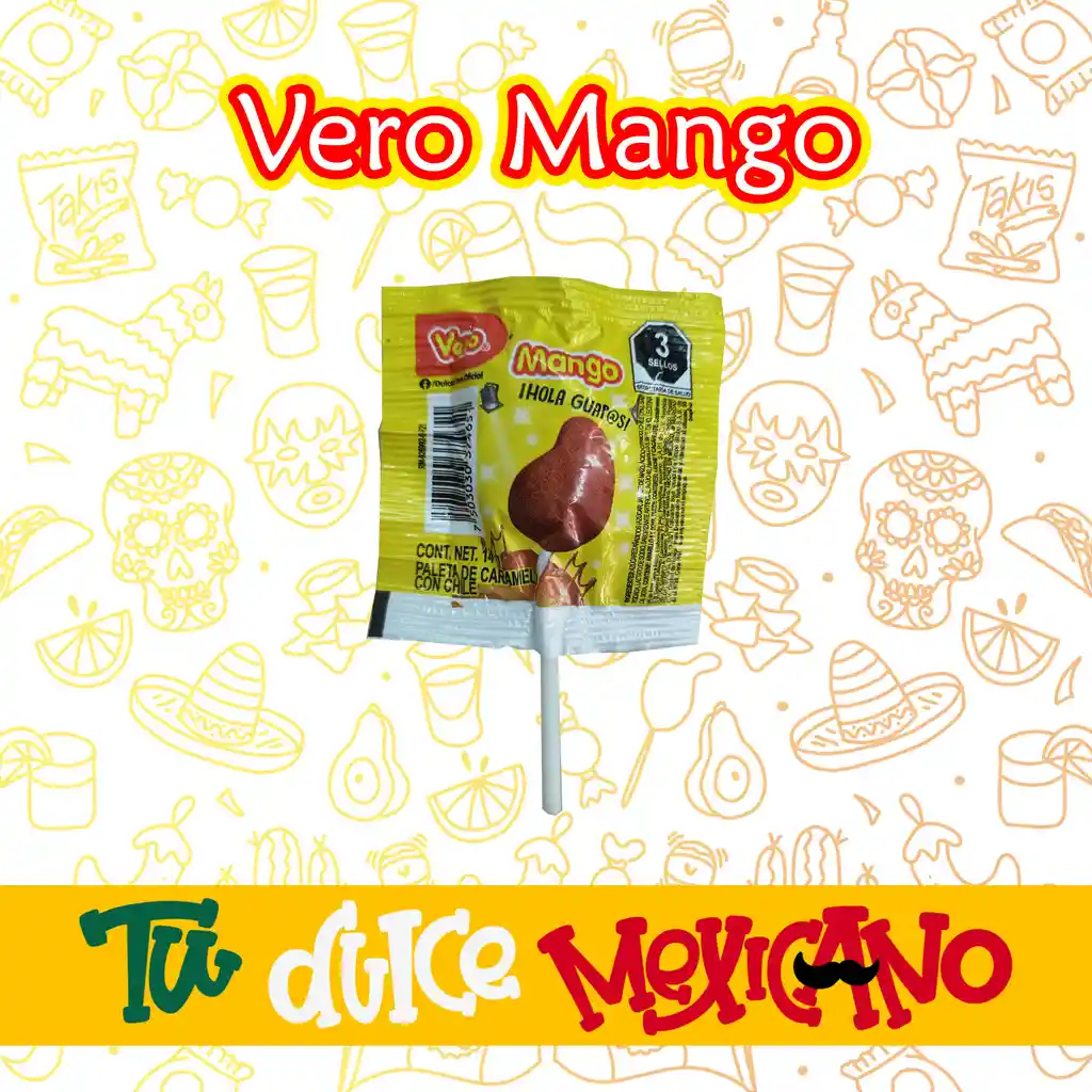 paleta de caramelo macizo con sabor a mango, cubierta con una capa de chile en polvo