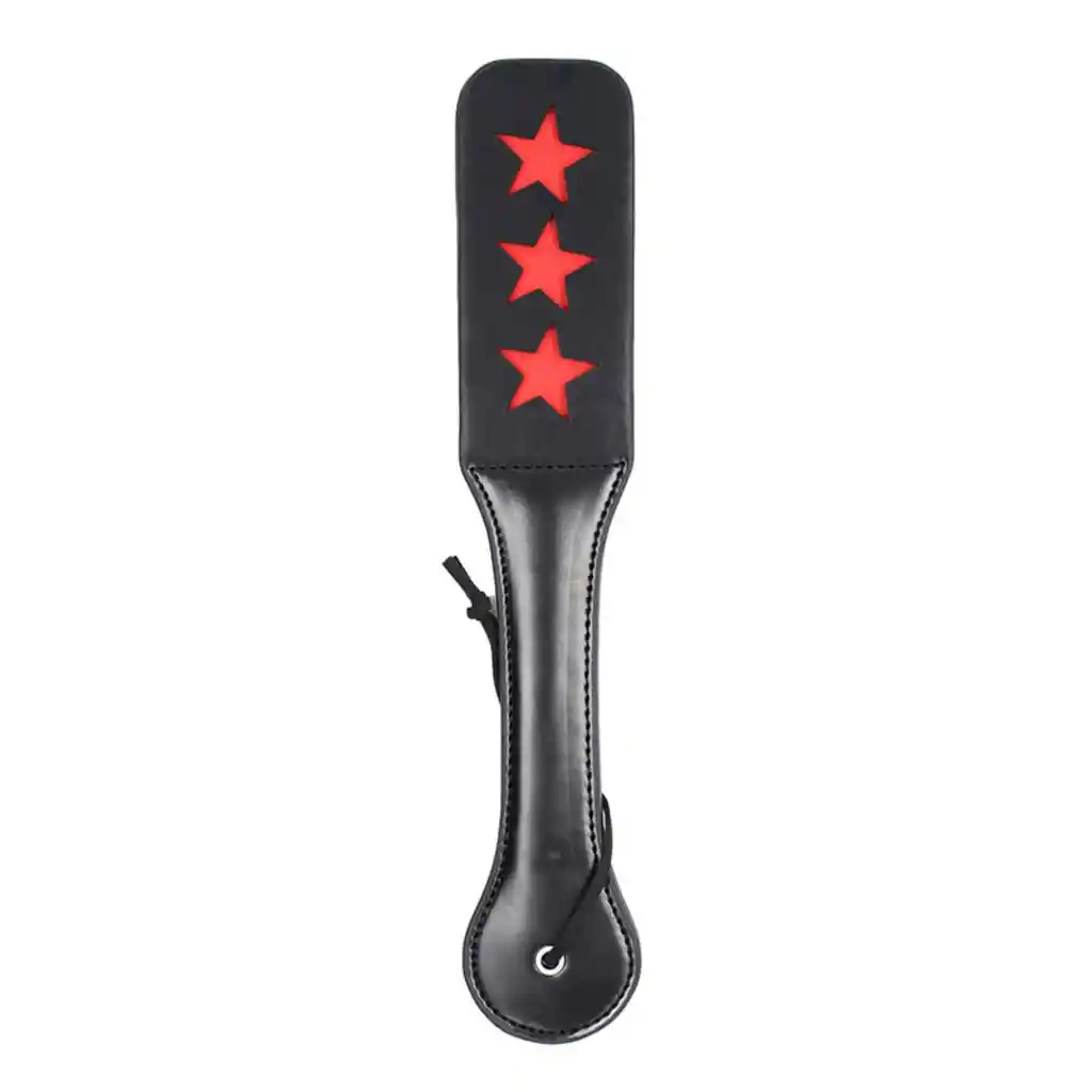 Azotador de cuero sintético. ∙ Diseño dividido (Split): Para un sonido de 'azote' extra fuerte! ∙ Detalle de estrellas: Las aberturas en forma de estrella dejan marcas con la práctica. ∙ Superficie de impacto de 13.5 cm: Proporciona un picor electrizante. ∙ Ancho de 6 cm: Ofrece una sensación de impacto amplia. ∙ Mango rígido de 19 cm: Con correa para la muñeca que permite un agarre seguro. Especificaciones: ∙ Material: Cuero sintético / Cuero PU ∙ Color: Negro ∙ Peso: 50g (ligero y fácil de usar) ∙ Medidas: 32.5 x 6 x 0.6 cm ∙ Largo del mango: 19 cm ∙ El paquete incluye: 1x Paleta azotadora