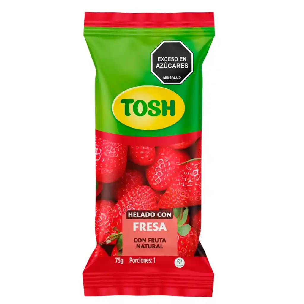 Tosh Fruti Fresa, una deliciosa paleta de fresa con trozos de fruta, ideal para disfrutar en cualquier momento y refrescarte con su sabor único.