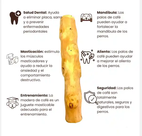 Coffe Bone es un Palo de madera con sabor a café, elaborado a partir de la madera del café. Producto 100% NATURAL, sin químicos, ni conservantes, ni colorantes, ni saborizantes. Una madera completamente segura, no desastilla, contiene celulosa que ayuda a la digestión de la mascota.