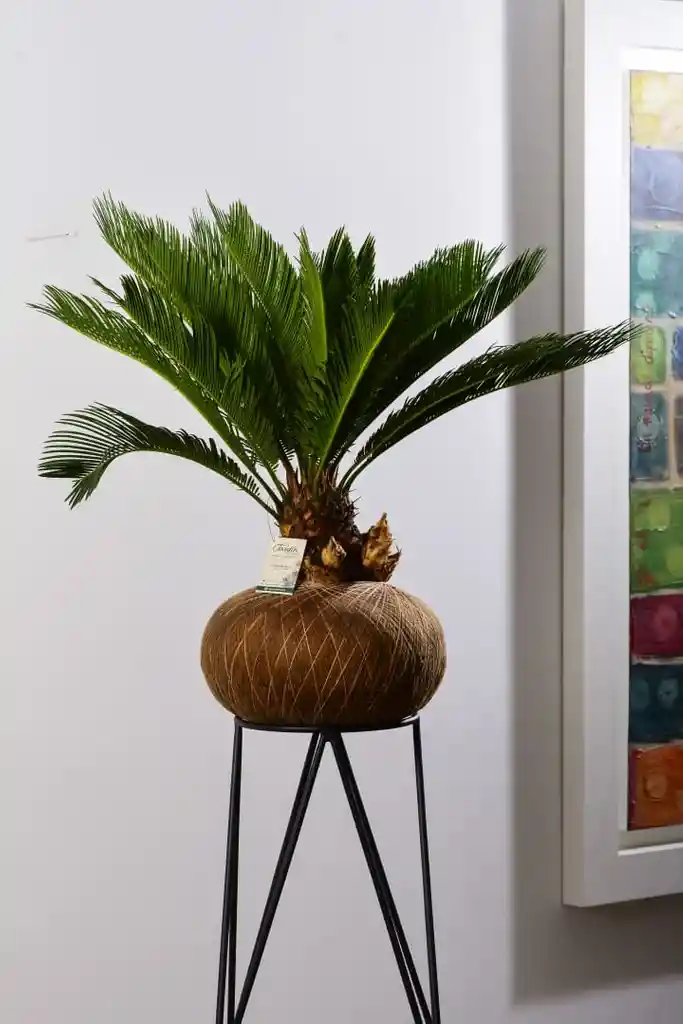 Palma Sica, ensambladas en técnica Japonesa kokedama, ideales para sitios con buena iluminación, dos horas de sol le sienta bien