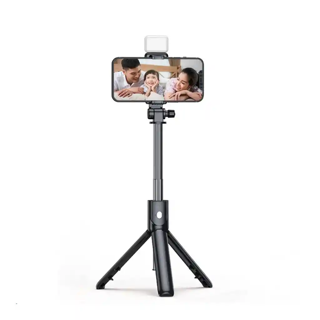 Palo Selfie, Selfie Stick con Trípode, Luz y Botón Inalámbrico Color: Negro Material: Fabricado en ABS (Acrilonitrilo Butadieno Estireno) y acero inoxidable. Tamaño: Se extiende desde 19 cm hasta 100 cm. Características: Palo de Selfie Extensible con Soporte 2 en 1: Este versátil palo de selfie combina las funciones de un palo selfie y un trípode. Su longitud máxima de 100 cm te permite capturar fotos y videos desde diferentes ángulos. Luz de Relleno con 2 Niveles de Ajuste de Brillo: La luz incorporada proporciona iluminación adicional para tus selfies y grabaciones en condiciones de poca luz. Puedes ajustar el brillo según tus necesidades. Rotación Libre de 360°: El soporte del teléfono se puede girar completamente en cualquier dirección, lo que te permite tomar fotos desde cualquier ángulo. Función de Selfie Bluetooth: El botón inalámbrico te permite tomar fotos sin necesidad de tocar el teléfono. Ideal para selfies individuales o fotos grupales en fiestas, graduaciones, bodas y viajes.