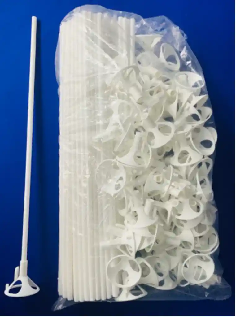 Palos blancos para globos con sus copas para poner los globos producto hecho a base de polietileno 100% reciclado Postconsumo en Colombia Vara y cono para globos de Latex Color Blanco Medida 37 cm Cantidad 100 unidades