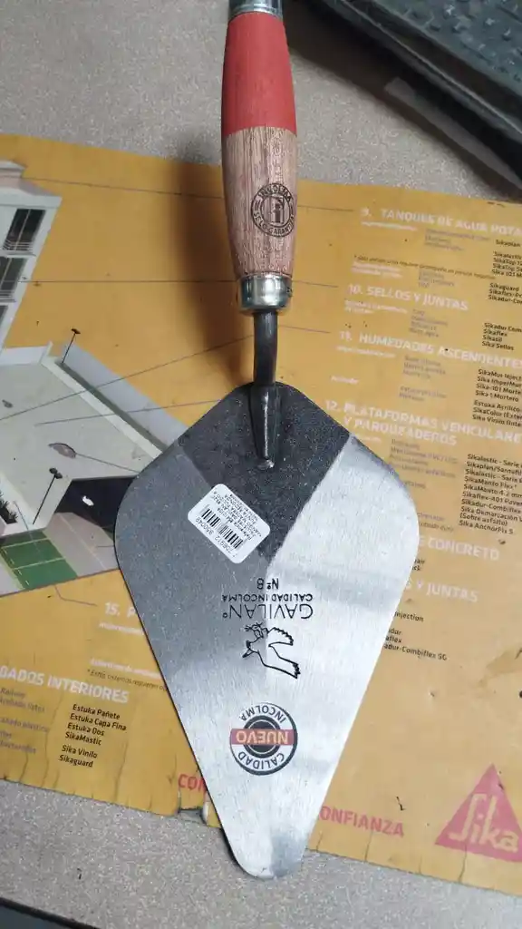 Herramienta manual de acero con mango de madera, utilizada para aplicar, extender y alisar mortero en trabajos de mampostería, ideal para uso en obra y construcción.