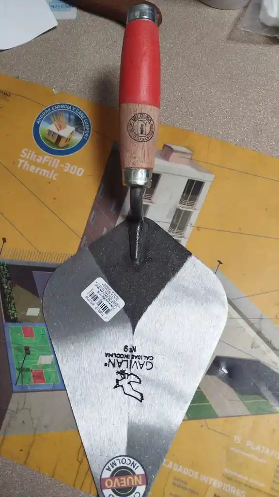Herramienta manual de acero con mango de madera, utilizada para aplicar, extender y alisar mortero en trabajos de mampostería, ideal para uso en obra y construcción.