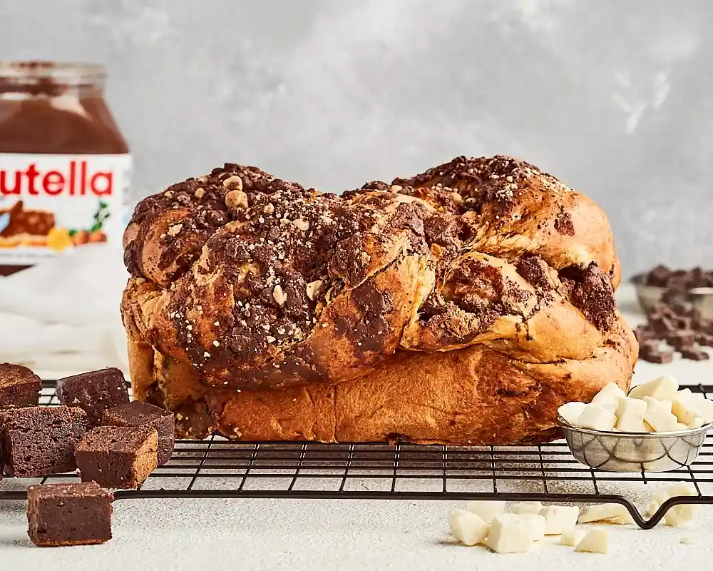 Pan de chocolate y nutella con trozos de brownie y chocolate blanco, cubierto por una corteza crujiente de nutella, chocolate semi amargo, maní troceado y tostado.