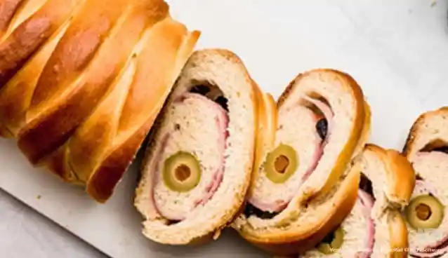 Pan suave y aromático, relleno de jamón, queso, aceitunas y pasas, envuelto en una masa dorada y ligeramente dulce que combina sabores salados y dulces en cada bocado