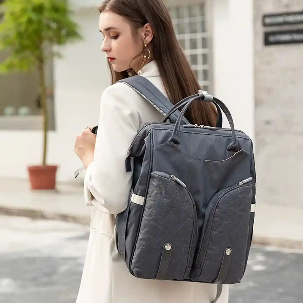 Espectacular pañalera convertible a cuna moisés con colchoneta, contiene cómodos bolsillos para diferentes usos, correas para coches, puerto USB. Su diseño mejora tu experiencia en el viaje, es ergonómico y elegante, está diseñado especialmente para colgarlo en el cochecito del bebé, tiene gran capacidad de espacio interno, se pueden colocar tarros de leche en polvo, ropa de bebé, pañales, talcos, pañitos húmedos, zapatos etc, con bolsillo para pañitos lateral que da mayor comodidad a la hora que cambiar al bebé.