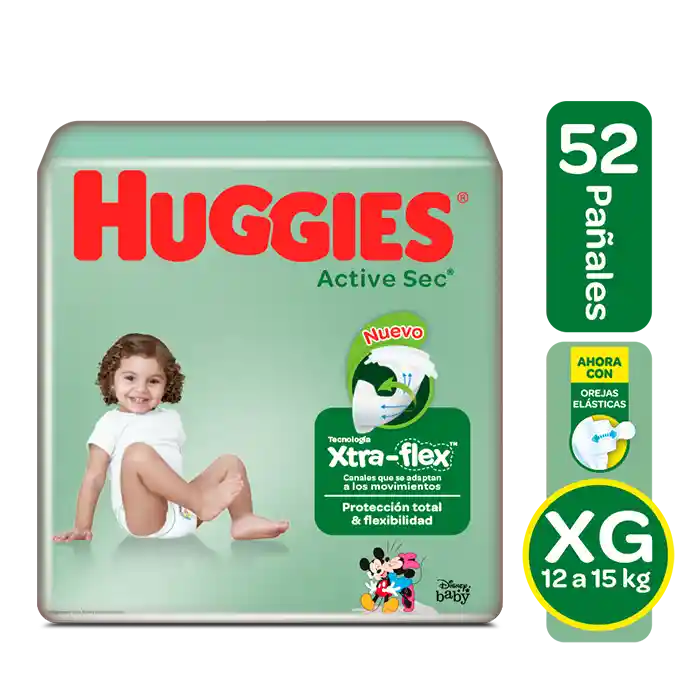 Etapa 4/XG, 10-17kg Nuevos Huggies Active Sec con tecnología Xtra-Flex. Los nuevos Huggies Active Sec tienen la exclusiva tecnología Xtra-Flex que ofrece protección total y flexibilidad* para acompañar cada paso del desarrollo de tu bebé. Cubierta externa suave. Distribución más rápida y mejorada. Con personajes de Disney.