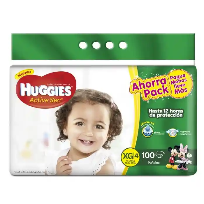 Etapa 4/XG, 10-17kg Nuevos Huggies Active Sec con tecnología Xtra-Flex. Los nuevos Huggies Active Sec tienen la exclusiva tecnología Xtra-Flex que ofrece protección total y flexibilidad* para acompañar cada paso del desarrollo de tu bebé. Cubierta externa suave. Distribución más rápida y mejorada. Con personajes de Disney.