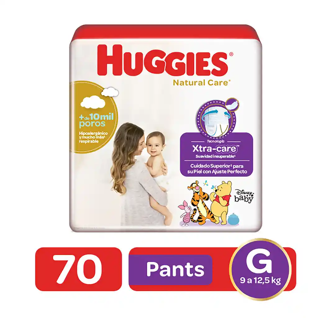 Etapa 3/G, 7-13kg Nuevos Huggies® Natural Care Pants con tecnología Xtra-Care. La máxima protección para su piel de Huggies® que ya conoces, ahora mucho más cómodo*: Canales suaves y respirables en forma de X, que distribuyen el pis de manera más uniforme a lo largo del pañal, para mantener la piel seca, fresca y protegida y con cintura elástica ahora mucho más suave para brindarle a tu bebé más comodidad. Capa especial para un bebé super sequito. Cuidado superior para su delicada piel. Cuidado puro y natural. Cintura elástica extrasuave que se ajusta a su pancita. Fibra suave y natural. Tecnología respirable con fibras naturales y muy suave. Dermatologicamente comprobado. 0% fragancia y parabenos. Fácil de poner y fácil de quitar. Para desecharlo solo enrolla el pañal, despega la cinta azul y asegúrala alrededor del pañal. Con personajes Disney.