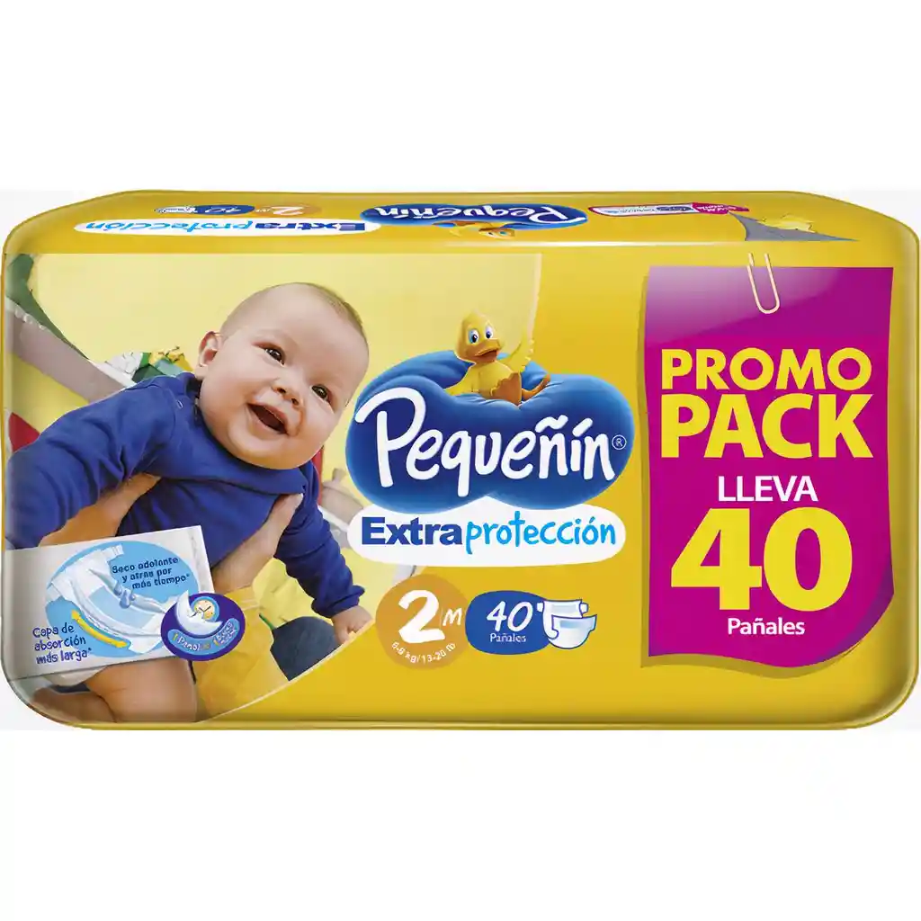 Etapa 2/M, 5.5-8kg Los nuevos Pañales Pequeñín Extraprotección cambiaron para cambiarlo todo. Ahora tienen una nueva tecnología con más gel absorbente en su interior que encapsula y retiene los líquidos evitando filtraciones, para que tu bebé esté seco y protegido. Su nueva tecnología con más gel, los hace menos gruesos, más ligeros, más flexibles y súper absorbentes, dándole a tu bebé máxima comodidad y ajuste para que se mueva libremente. Tienen una capa de absorción muy larga, que distribuye la orina rápidamente para que no se concentre en un solo lugar, así estará seco adelante y atrás por más tiempo, logrando que tu bebé tenga la piel más seca. Para que tu bebé esté seguro cuentan con doble barrera antifugas, para evitar filtraciones. Su cubierta ahora es más suavecita para proteger la piel de tu bebé. Su alta capacidad de absorción permitirán que tu bebé pueda estar seco y cómodo durante el día y toda la noche. Su empaque ahora es más compacto, porque gracias a su nueva tecnología con más gel en su interior el pañal es menos grueso, más ligero y más flexible. Este empaque es más fácil y práctico de llevar. Además usa menos plástico, ayudando a cuidar el medio ambiente.