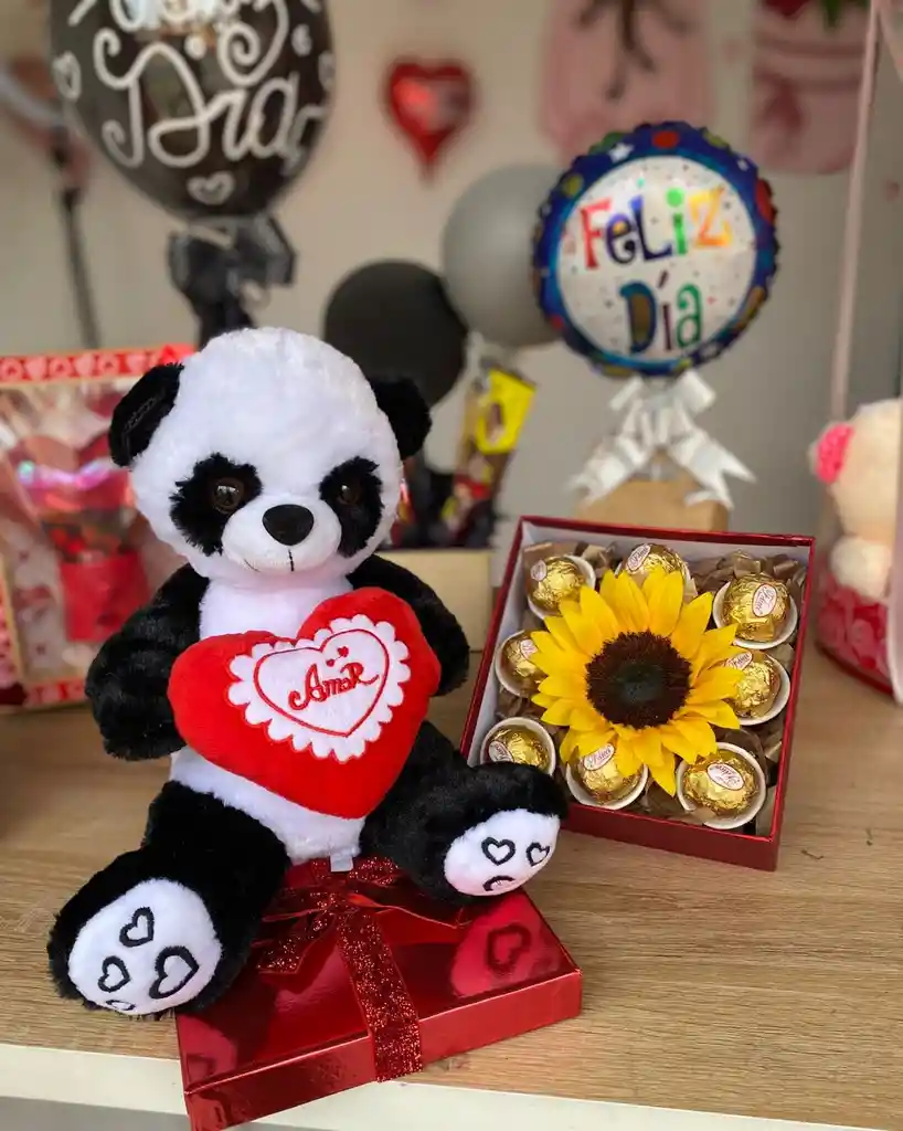 Incluye: caja decorativa, chocolates x8, girasol x1, peluche panda de aproximadamente 30cm, decoración y mensaje personalizado