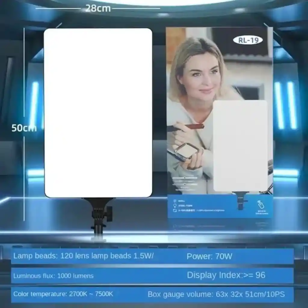 Dimensiones: Aproximadamente 28 cm de largo y 50 cm de alto. Potencia: 70W. Perlas de lámpara: 120 perlas de lámpara de lente de 1,5 W. Flujo luminoso: 1000 lúmenes. Índice de visualización (CRI): \(\ge 96\). Temperatura de color: Ajustable de 2700K a 7500K. Volumen de la caja: 63x 32x 51cm/10PS. Características adicionales: Luz LED regulable (ajustable de 0 a 100%). Control remoto para ajustar la intensidad y la temperatura de color. Diseño portátil y compatible con trípodes universales. Ideal para fotografía, video, vlogging y entrevistas, proporcionando una luz suave y uniforme.