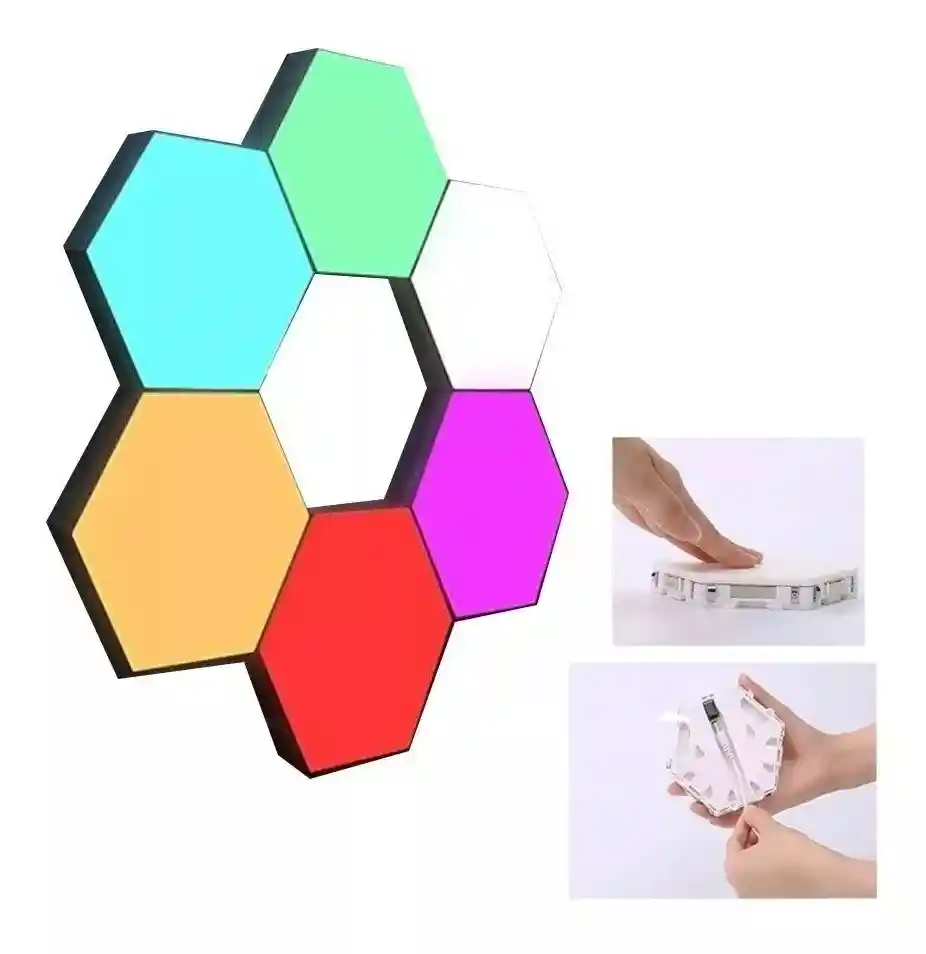 Luz panel hexagonal sensible al tacto Lámpara nocturna Hexagonal LED Luces magnéticas Lámpara de pared luz nocturna ***Nota: cada panel viene con un color preestablecido (AZUL,VERDE,ROJO,AMARILLO,MORADO Y BLANCO),estos colores NO se pueden cambiar*** Materiales de pantalla de ABS y PC de alta calidad, luz uniforme y fuerte transmisión de luz. El toque físico puede encender y apagar la luz de la pared. Los componentes se pueden unir fácilmente mediante un imán ubicado en el borde del producto. La forma hexagonal permite que estos componentes se aniden juntos y brinda oportunidades para una variedad de estructuras diferentes. Diseño geométrico único, no solo se puede iluminar, sino que también puede decorar tu casa. Ampliamente utilizado, se puede colocar en la sala de estar, dormitorio, estudio, restaurante, hotel, etc. la profundidad del hexagono puede dicernir por la foto, pero su diseño es exactamente igual a las fotos. ¿Cómo se fijan los módulos a la pared? Los módulos hexagonales se pueden unir a la pared usando las almohadillas adhesivas provistas en el paquete de inicio o usando los orificios en la parte posterior de cada módulo para enganchar con clavos,}. ¿Cuál es el consumo de energía por módulo? El consumo de energía por módulo es de 2W. ¿Cuántos módulos se pueden conectar a una fuente de alimentación? Sugerimos una cantidad máxima de 18 módulos que funcionan con una fuente de alimentación. ¿Cómo se alimentan los módulos? Cada módulo se conecta a través de bordes magnéticos, la energía se transfiere a través de cada módulo a través de pines de metal que sobresalen de cada borde. (funcionan con pilas) (el acople magnetico es a la pared, no entre los hexagonos