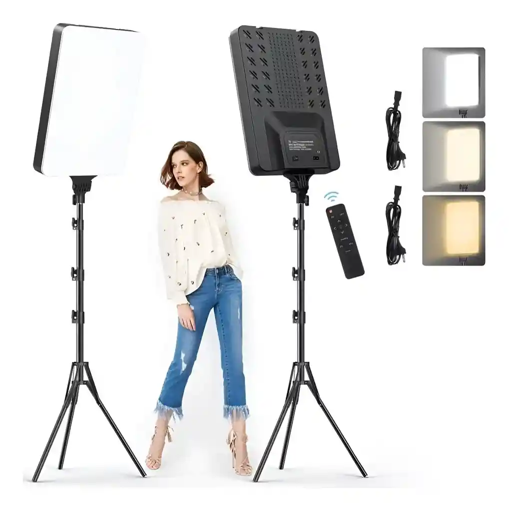 Medidas 45cm Largo x 28cm Ancho Panel De Control Táctil En La Parte Trasera y Control Remoto Incluye : 1 Panel Led , Control Remoto , Tripode - Trípode ajustable: Incluye un trípode de hasta 2 metros de altura que se ajusta a diferentes medidas para una mayor flexibilidad. Este panel LED es ideal para filmación de estudio, fotografía y video. Cuenta con un control remoto que permite ajustar el brillo, la temperatura y el color de la luz. Se puede cambiar a blanco frío o cálido. También ir cambiando progresivamente o de forma directa el brillo de la luz a claro o a oscuro. - Temperatura 3200K - 5700K - CRI o RA96+ significa que la luz del panel LED es de alta calidad y reproduce los colores de forma casi perfecta - Ajuste brillo: 5% -100% Diseñado para las exigencias de profesionales: - Maquilladoras: Logra una iluminación impecable para resaltar la belleza de tus clientes. - Creadores de contenido: Captura videos e imágenes con una iluminación perfecta para tus redes sociales.