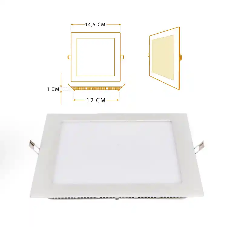 Panel led calido o amarillo cuadrado Extra delgado, elegante y moderno. Ideal para ambientes en áreas uniformes o iluminación principal. El panel de Incrustar incluye soporte o herraje troquelado adaptable a cualquier medida y chazos de instalación si requiere fijación. PANEL LED 9W - Potencia 9W - CRI (RA) >70% - Voltaje 85v-10v - Flujo lumínico 240 Lm - Vida Útil 20000 horas - Color luminaria Blanca - Material Aluminio y PMAM - Luz Blanca 3.500k