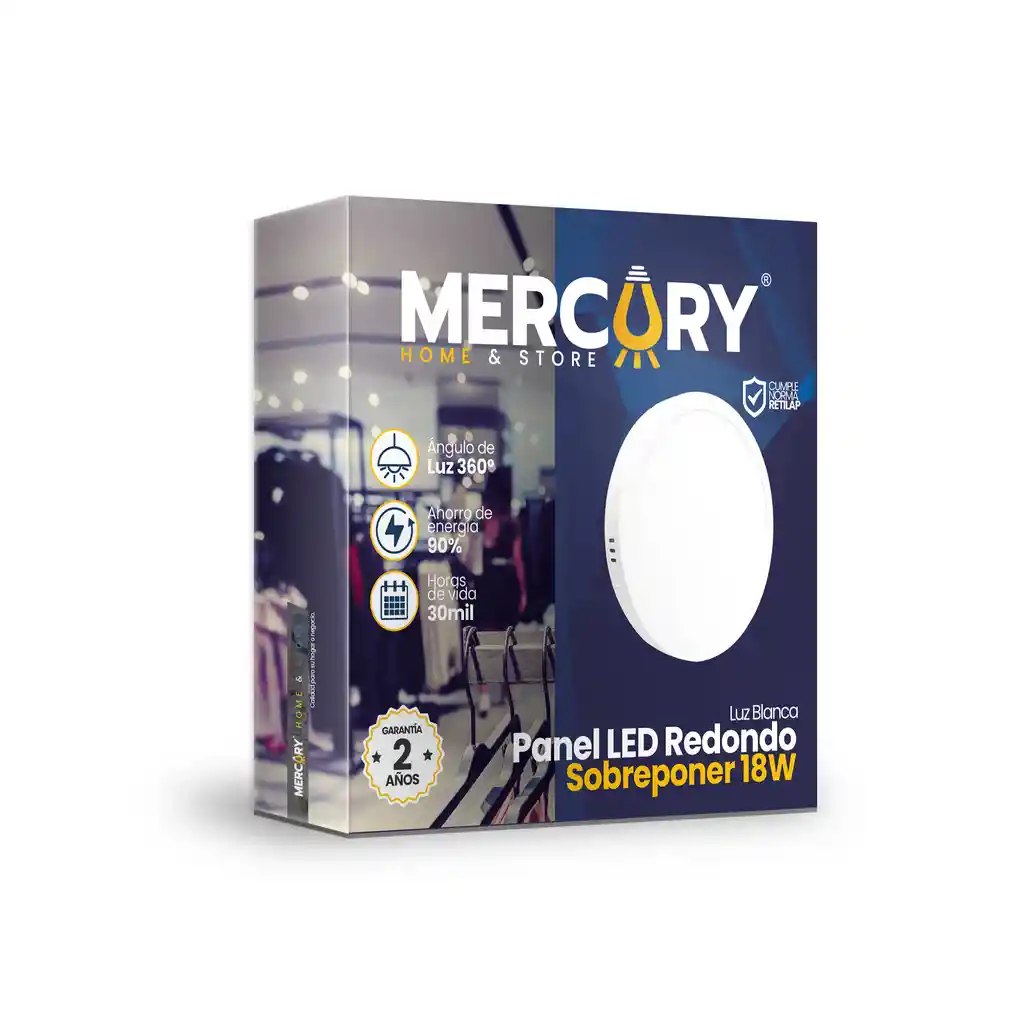 Panel LED redondo de sobreponer de luz fría que cuenta con una potencia máxima de 18 Watts, diseñado para uso interior, exterior y comercial. Cuenta con 12 meses de garantía por defectos de fábrica, además de cumplir con la norma RETILAP
