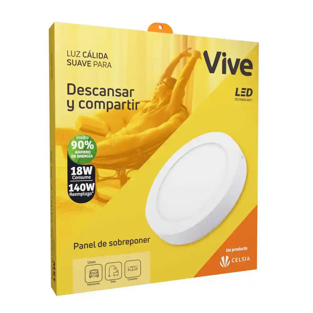 Panel LED Sobreponer Vive 18W Luz cálida. Si quieres un ambiente acogedor, esta es la luz ideal. Además ayuda a preparar el cuerpo para el descanso y el sueño. Usos recomendados: habitación, sala y comedor. Ilumina áreas de 12 metros cuadrados aprox.