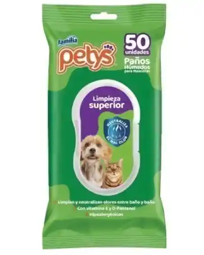 Los Paños Húmedos Petys son la solución ideal para mantener la higiene de perros y gatos entre baños, ofreciendo una limpieza superior que neutraliza los malos olores de forma efectiva. Su fórmula hipoalergénica está enriquecida con vitamina E y D-Pantenol, ingredientes que cuidan la piel y el pelaje de tu mascota mientras eliminan la suciedad. Este empaque de 50 unidades es perfecto para refrescar a tu mejor amigo de manera práctica y segura en cualquier momento del día.