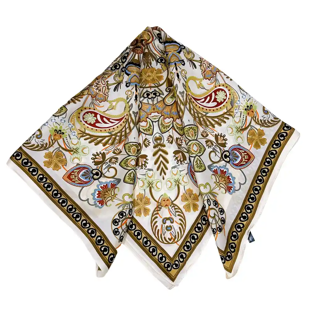 Pañoletas en poliester ideales para acompañar tus outfits. Referencia: Fiori Miel. Medida: 70 cm x 70 cm