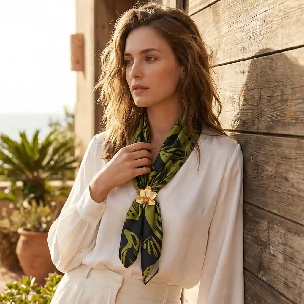 Una pañoleta que transforma cualquier look con un toque de elegancia natural. Su diseño sofisticado en tonos verdes inspirado en la naturaleza aporta frescura, estilo y personalidad.