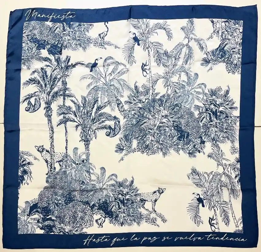Pañoleta en seda inspirada en la selvas tropicales del país. Son hechas por manos de personas reincorporadas del grupo de las FARC después del proceso de Paz en el año 2016 donde MANIFIESTA a través de la moda contribuye a la ocupación laboral de estos civiles en búsqueda de nuevas oportunidades en una nueva vida CIVIL.