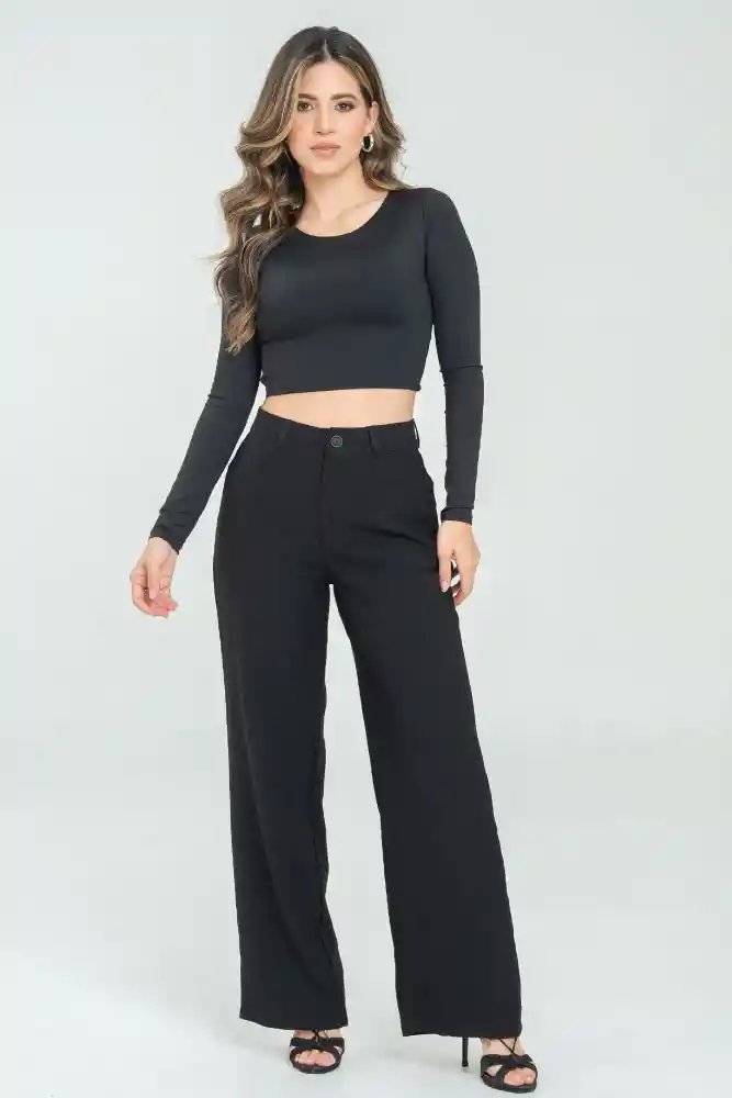 Pantalón en tejido plano fondo entero, talle alto, pretina de 5cms con botón de 32L y pasadores de 1cm, bolsillos funcionales con boca redonda en la parte delantera y bolsillo parche en la parte trasera, bota recta, silueta semi ajustada, ruedo de 2cms.