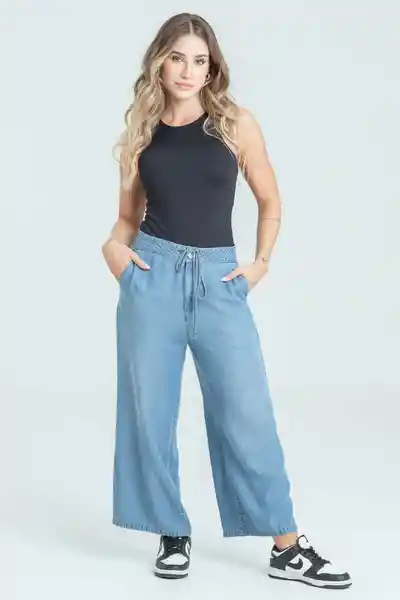 Culotte en Denim 100% Tencel Tono Medio Con Manualidad Tiro Alto Pretina Con Botón Jareta y Amarre Bolsillos en Diagonal y Bolsillo Parche en Posterior.