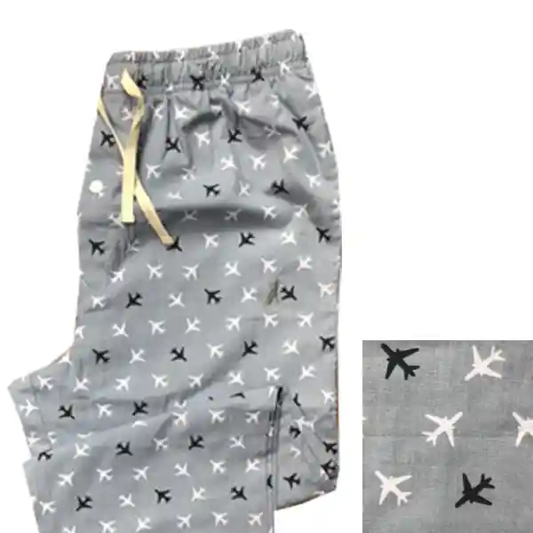 Pantalón de Pijama Gris claro conMiniprint de aviones en gris oscuro y blanco Composición: 100% AlgodónCaucho y cinta en la cinturaBolsillos lateralesHecho en Colombia