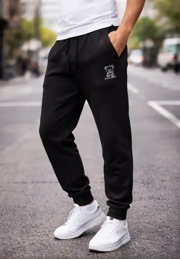 Jogger cómodo y versátil, ideal para un look casual o deportivo. Confeccionado en tela suave y abrigada, perfecta para el día a día. Su diseño moderno ofrece un ajuste cómodo gracias a la cintura elástica con cordón ajustable y puños en los tobillos que estilizan la silueta. Cuenta con bolsillos laterales con cierre, ideales para llevar tus objetos personales de forma segura, y un detalle bordado de oso en la pierna que le da un toque urbano y original