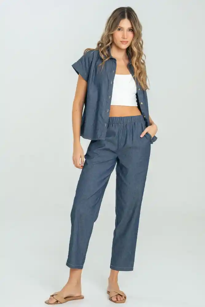 Harem Chambray Tiro Alto Elástico de 4 cms en Pretina Bolsillos en Diagonal Silueta Semi Ajustada.