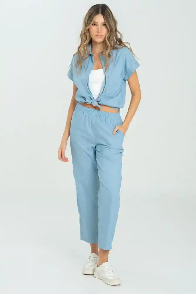 Harem Chambray Tiro Alto Elástico de 4 cms en Pretina Bolsillos en Diagonal Silueta Semi Ajustada.