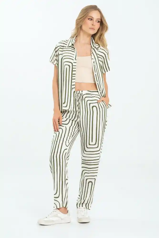 Pantalón en tejido plano estampado, pretina enresortada con elástico de 3cms, jareta en la misma tela, bolsillos en los laterales del pantalón, ruedo de 2cms, silueta semi ajustada tipo harem.