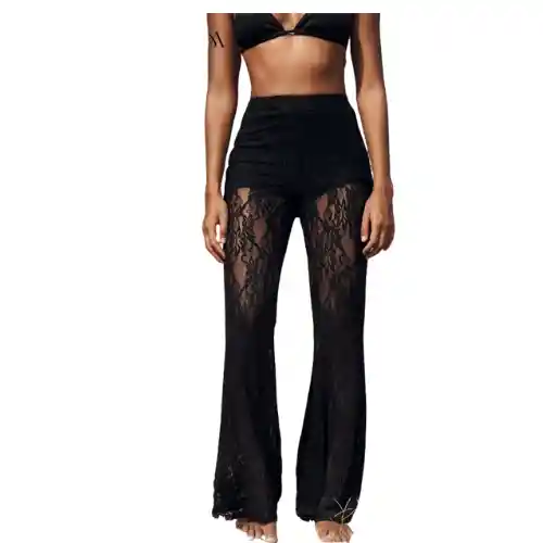 Pantalón largo Encaje floral transparente Color negro Tiro alto Tela elástica y suave Ajuste cómodo y favorecedor TALLA S