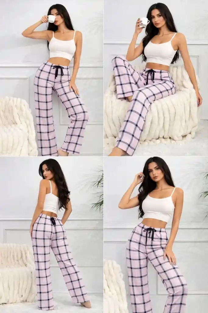 Pantalón tipo lounge de diseño a cuadros, confeccionado en tela semibrillante, suave al tacto y de textura delgada y vaporosa que brinda frescura y comodidad. Su silueta relajada con cintura elástica y ajuste con cordón permite un fit adaptable y favorecedor. Ideal para estar en casa o crear looks casuales con estilo, combinando confort y ligereza en una prenda versátil para el día a día.