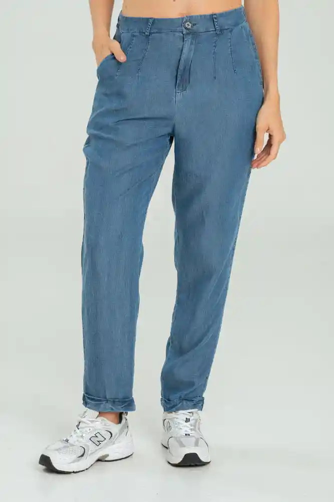 En Tencel Tiro Alto Tono Oscuro Pretina Con Elástico en Posterior Botón y Cierre en Frente Bolsillos en Diagonal Detalle de Tapa Con Botón en Posterior Ruedo Con Guardapolvo.