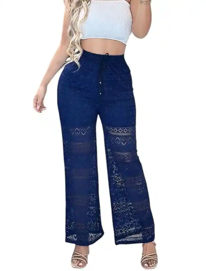 Pantalón Palazzo bota ancha con cintura elástica de amarre con cordón ,en ojalillo,encaje con short interno El dibujo del encaje puede variar de posición y forma