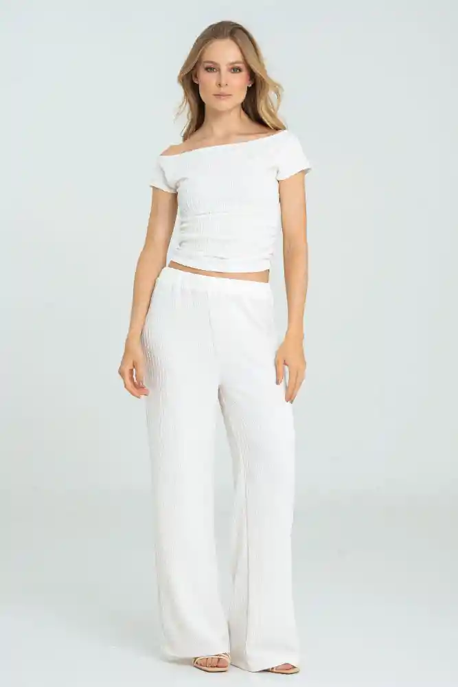 Pantalón en tejido con textura especial, talle alto, pretina con elástico de 3cms, bota recta, silueta semi ajustada.