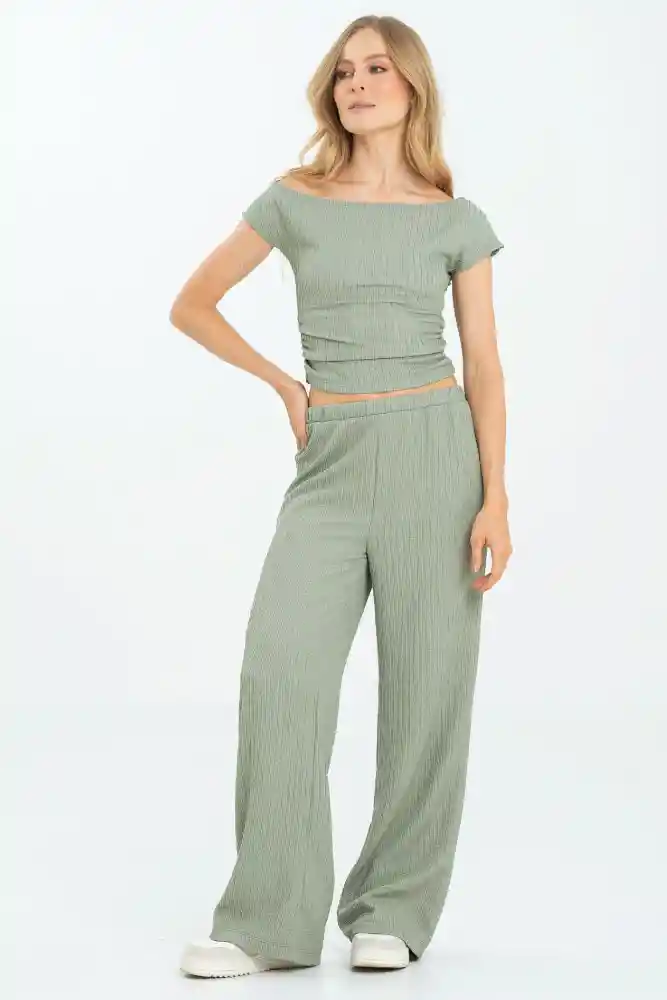 Pantalón en tejido con textura especial, talle alto, pretina con elástico de 3cms, bota recta, silueta semi ajustada.