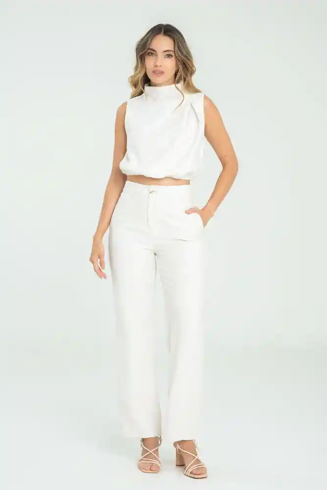Pantalón en tejido plano, talle alto, pretina de 5cms, botón 32L, bolsillos en los laterales del pantalón, bota recta, silueta semi ajustada.