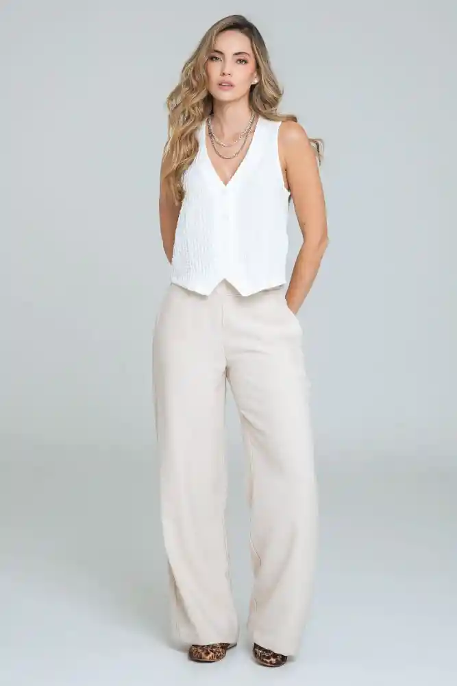 Pantalón en tejido plano fondo entero, talle medio, detalle de pretina delantera con ojaletes y charreteras con broche de tapa niquel, cierre semi invisible en costado, bolsillos en los laterales, bota ancha. ruedo de 2.5cms.