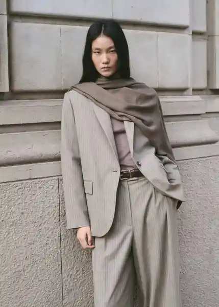 Cierre Delantero de Botón Gancho y Cremallera Ocultos Con Tapeta Detalle de Pinzas Diseño Recto Dos Bolsillos Laterales Estampado Rayas Tejido Mezcla de Lana Tiro Bajo Total Look Trabillas - 27014792_35.