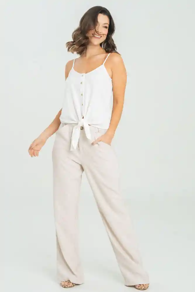 Pantalón bota recta en tejido plano fondo entero, ajusta con cierre y botón, bolsillos en laterales, bolsillos tipo parche en posterior, pinzas en posterior, silueta semi ajustada.