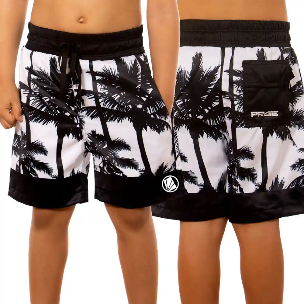 Pantaloneta NIÑOS PRAIE REF: 2014BN Palmeras (Blanco/Negro): Material: 100% Poliéster Tecnologías: Protección solar UPF 30+, Repelencia a líquidos y suciedad, Anti manchas de sudor, resistente al cloro, colores mas vivos por más tiempo. Pretina con elástico interno / Ajustable Malla de color Negro al interior Bolsillos laterales y Posterior Accesorio para llaves en el bolsillo posterior 1 pieza Producto diseñado y producido en Colombia
