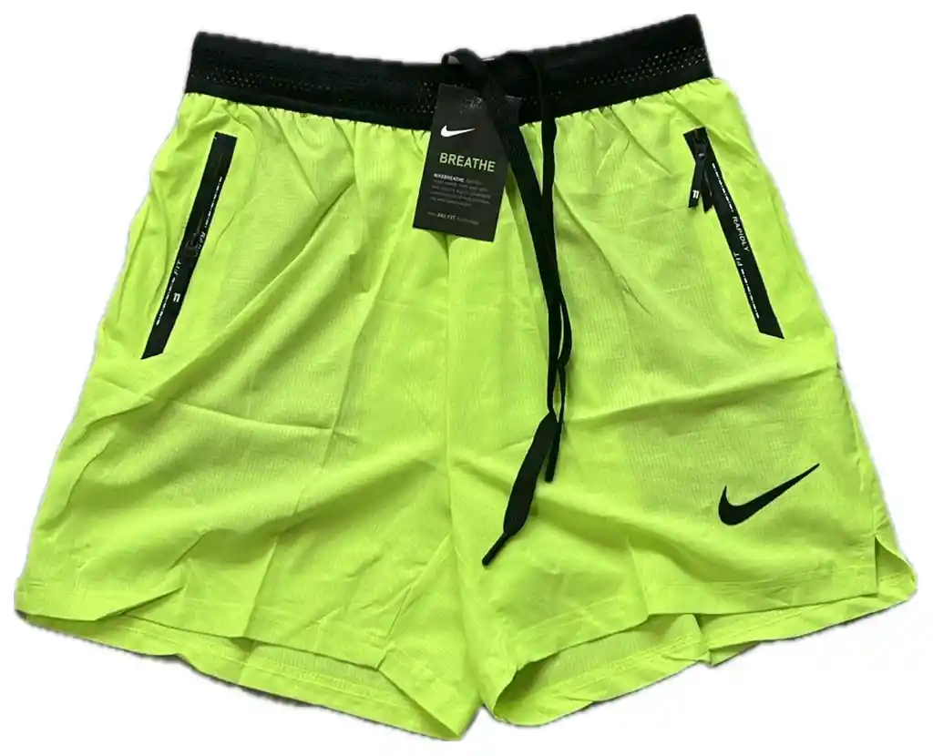 Pantaloneta replica hombre, color verde fosforescente corta, talla L, con cremalleras en los bolsillos, sin forro interno
